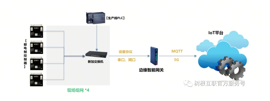 現(xiàn)場(chǎng)共計(jì)35臺(tái)獨(dú)立的焊接設(shè)備控制器,相互之間未聯(lián)網(wǎng),綜合數(shù)據(jù)采集成本,需首先構(gòu)建4組小型局域網(wǎng)將焊接控制器數(shù)據(jù)和匯總至4臺(tái)交換機(jī)。再分別從4臺(tái)交換機(jī)加裝邊緣智能網(wǎng)關(guān),通過(guò)5G將數(shù)據(jù)匯總至該企業(yè)IoT平臺(tái)統(tǒng)一存儲(chǔ)。
