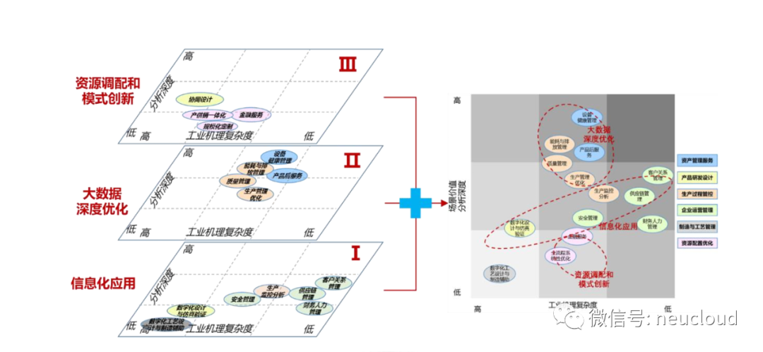 總結來看,工業互聯網平臺應用實現了從信息化到網絡化、智能化的全覆蓋,并且由單點信息化走向跨域智能化,呈現出三大發展層次:
