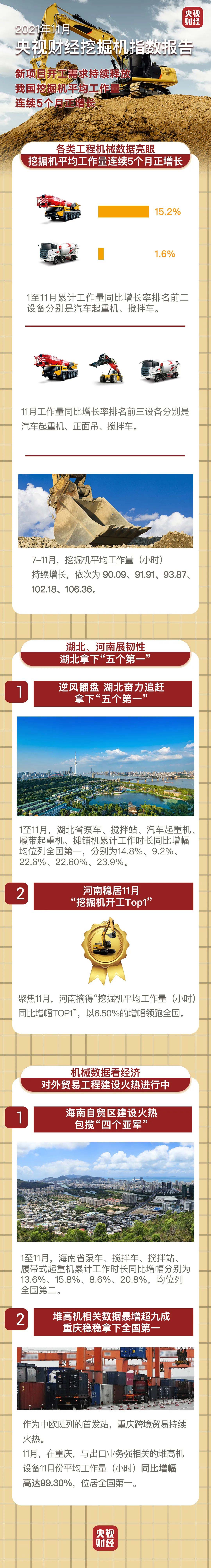 挖掘機指數顯示,1-11月,海南省泵車、攪拌車、攪拌站、履帶式起重機累計工作時長同比增幅位列全國第二、第二、第二、第二,包攬“四個亞軍”!