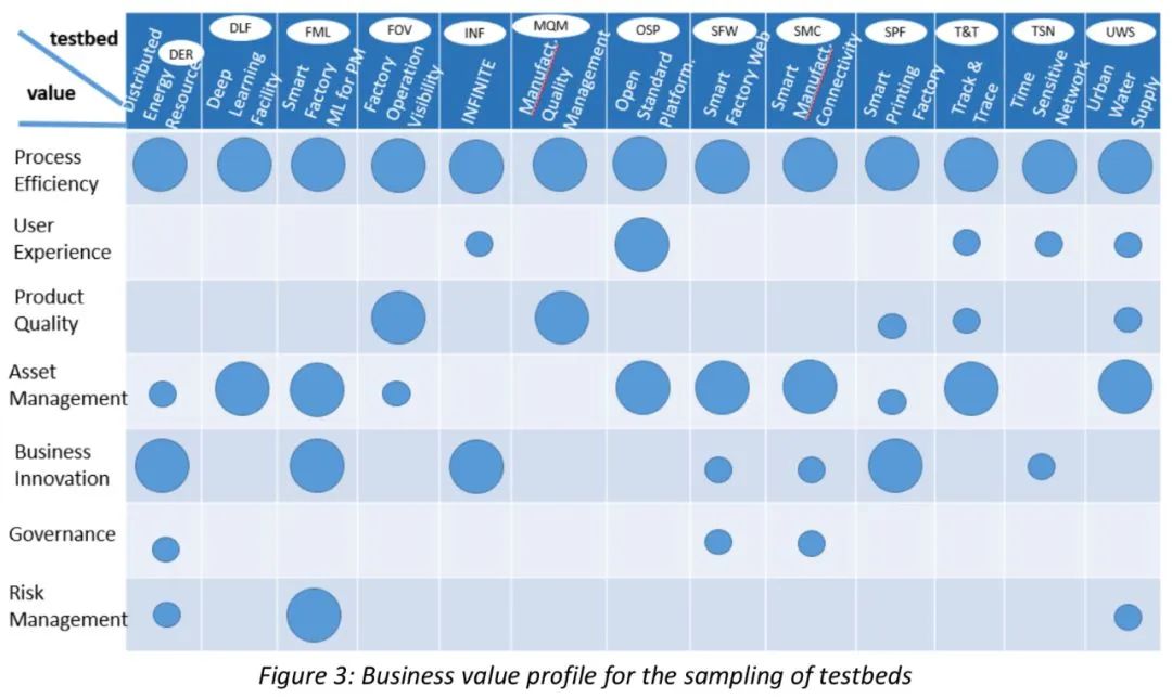 IIC白皮書中匯總了各個(gè)測(cè)試床的預(yù)期業(yè)務(wù)價(jià)值,涵蓋主要價(jià)值(大圓點(diǎn))和次要價(jià)值(中圓點(diǎn)和小圓點(diǎn))。
