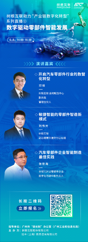 2022年6月8日,在廣州市“鏈長制”辦公室(廣州市工業(yè)和信息化局)的指導(dǎo)下,樹根科技聯(lián)合ATC汽車技術(shù)平臺,舉辦樹根科技助力產(chǎn)業(yè)鏈數(shù)字化轉(zhuǎn)型系列直播之“數(shù)字驅(qū)動零部件智能發(fā)展”活動。特邀樹根科技、全球TOP10零部件企業(yè)數(shù)字化專家,線上為聽眾帶來汽車零部件企業(yè)的數(shù)字化轉(zhuǎn)型分享。