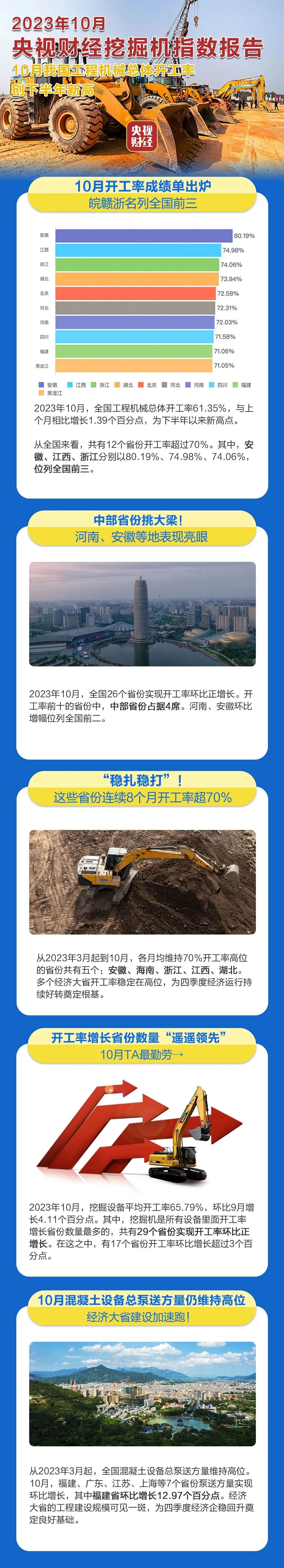 挖掘機是基礎設施建設的“標配”,是反映基礎設施建設、觀察固定資產投資等經濟變化的風向標。央視財經與三一重工、樹根科技聯合打造的“央視財經挖掘機指數”日前發布了最新相關數據。10月我國工程機械總體開工率61.35%,創下半年新高。我國各項基礎設施建設加速,多組數據展現中國經濟澎湃動能,高質量發展穩步推進。