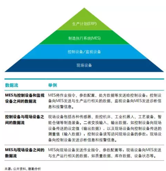 德勤調(diào)研結(jié)果顯示,目前企業(yè)致力于打通從ERP到MES乃至現(xiàn)場設(shè)備的數(shù)據(jù)流,但這也僅是從生產(chǎn)到執(zhí)行的打通,未來 還需將產(chǎn)品數(shù)據(jù)、供應(yīng)鏈數(shù)據(jù)串聯(lián)。我們將生產(chǎn)數(shù)據(jù)流分為兩個環(huán)節(jié):一、打通生產(chǎn)計劃與執(zhí)行系統(tǒng)的數(shù)據(jù)流;二、執(zhí)行與監(jiān)控和現(xiàn)場設(shè)備的數(shù)據(jù)流。