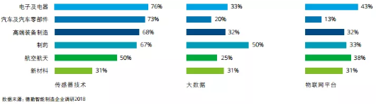 從行業(yè)應(yīng)用來看,電子及電器行業(yè)傳感 器和平臺應(yīng)用最為普及,76%的受訪企業(yè)利用傳感器采集數(shù)據(jù),43%的企業(yè)利用物聯(lián)網(wǎng)平臺,但僅有33%的企業(yè)采用大數(shù)據(jù)技術(shù)分析所采集的數(shù)據(jù)。汽車及零部件制造行業(yè)傳感器技術(shù)應(yīng)用也有較高普及率達(dá)73%,但大數(shù)據(jù)和平臺應(yīng)用低于其他受訪行業(yè)。制藥行業(yè)大數(shù)據(jù)技術(shù)利用最為積極,因為醫(yī)藥行業(yè)早已面臨海量數(shù)據(jù)和非結(jié)構(gòu)化數(shù)據(jù)挑戰(zhàn)(見下圖)。