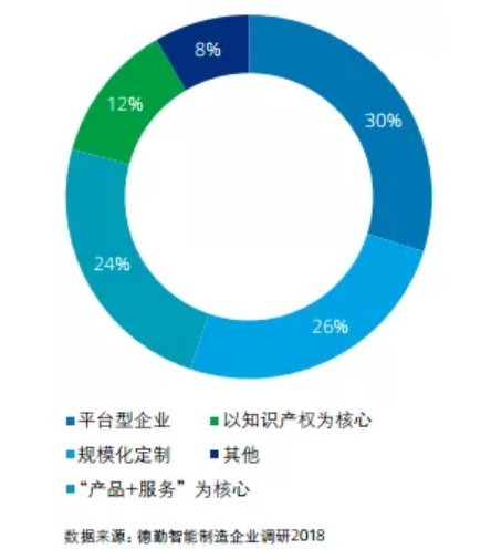 德勤調(diào)研發(fā)現(xiàn)企業(yè)對未來商業(yè)模式的規(guī)劃大致呈四類:30%的受訪企業(yè)未來商業(yè)模式將以平臺為核心,26%的企業(yè)走規(guī)模化定制模式,24%以“產(chǎn)品+服務(wù)”為核心向解決方案商轉(zhuǎn)型,12%以知識產(chǎn)權(quán)為核心(見下圖)。
