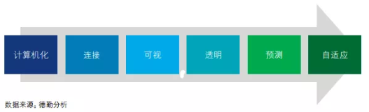 企業(yè)數(shù)字化能力素質(zhì)體現(xiàn)在其利用數(shù)據(jù)指導(dǎo)生產(chǎn)以及系統(tǒng)自優(yōu)化的能力。我們借鑒國際普遍認(rèn)可的工業(yè)4.0發(fā)展路徑,將企業(yè)智能化成熟度分為六個階段:計算機(jī)化、連接、可視、透明、預(yù)測和自適應(yīng)。
