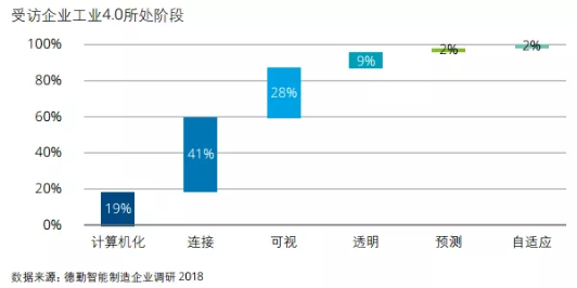 隨著中國兩化融合和工業(yè)物聯(lián)網(wǎng)建設(shè)等多項舉措推進(jìn),制造型企業(yè)數(shù)字化能力素質(zhì)顯著提升,大部分企業(yè)正致力于數(shù)據(jù)縱向集成。德勤調(diào)研結(jié)果顯示,81%的受訪企業(yè)已完成計算機(jī)化階段,其中41% 處于連接階段,28%處于可視階段,9%處于透明階段,而預(yù)測和自適應(yīng)階段的企業(yè)各自占2%。