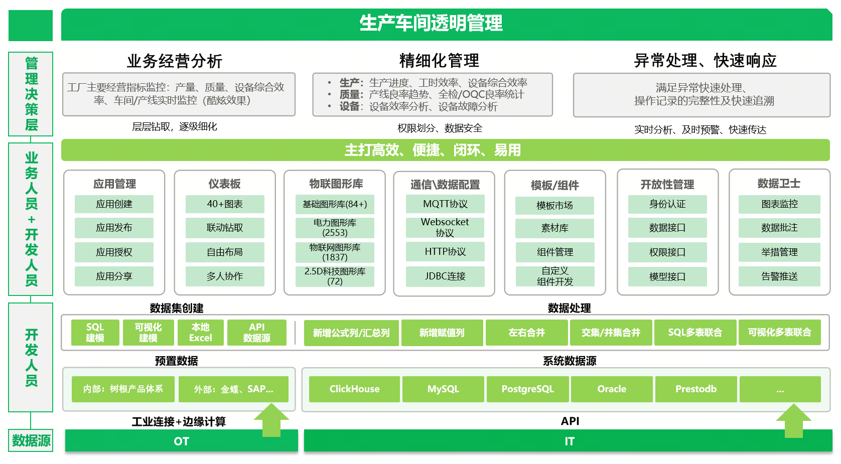 提供數據接入、數據建模、數據分析、數據應用(如設備OEE、生產成本、交付周期)等功能